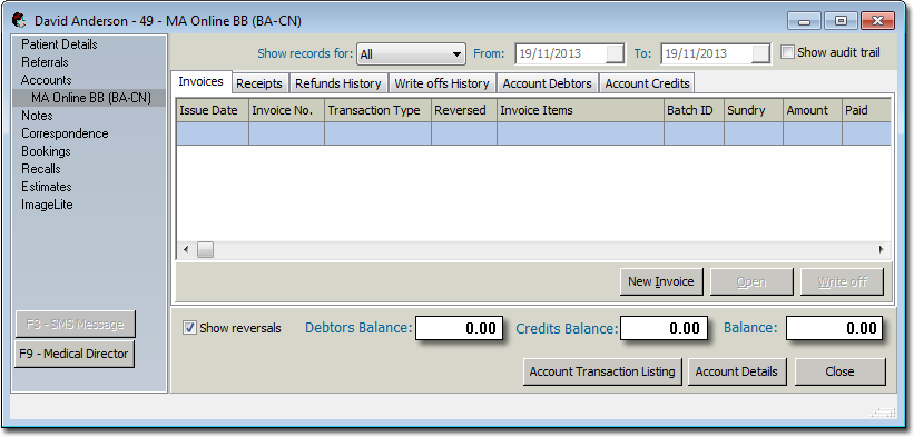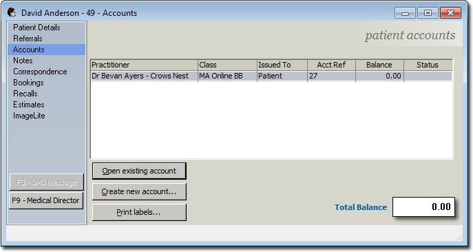 Open a patient record and select Accounts from the menu.