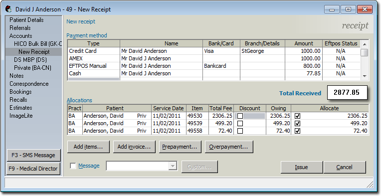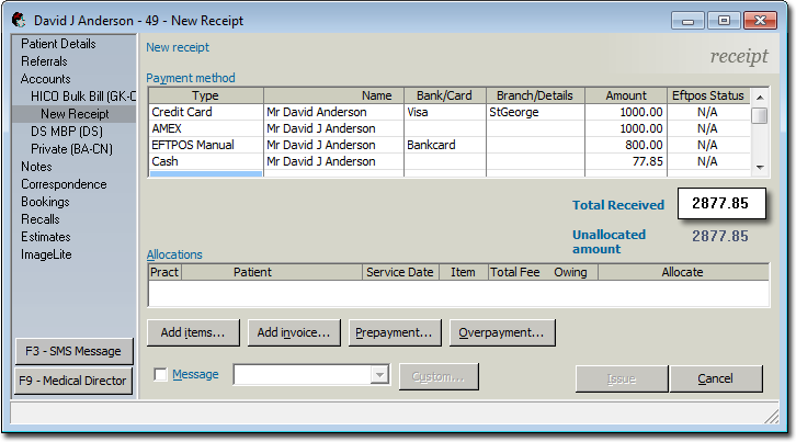 When you have finished allocating the receipt, click OK. You will be returned to the New Receipt window where you can now see how the payments have been allocated.