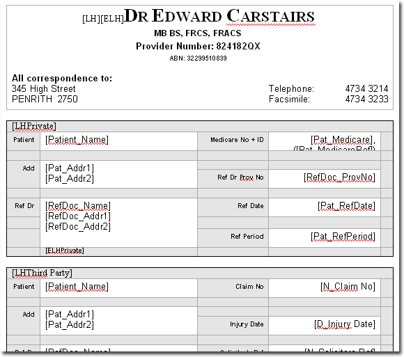 - The grey section of the template begins with the field [LHPrivate]and ends with the field [ELHPrivate]. This section governs what will appear at the bottom of any printed invoices, receipts, transaction listings or statements, for patients whose account class is Private (in this example).