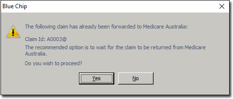 - If you select 'No', the process is cancelled and you are returned to the View Medicare Australia Claim window.