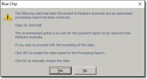 - If you select 'Yes', Bluechip automatically creates a receipt for the claim based on the amount details given in the Processing Report and finalises the claim, after which the status of the claim reads 'Manually Receipted'.
