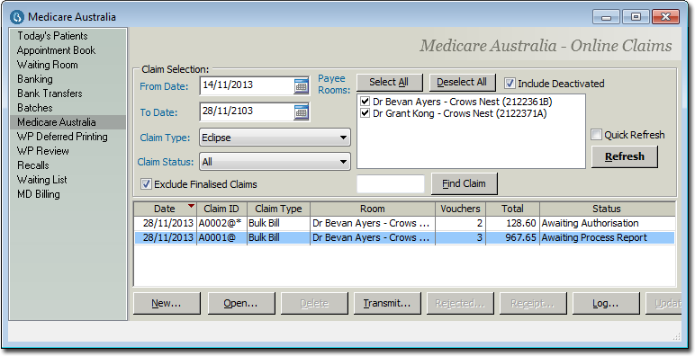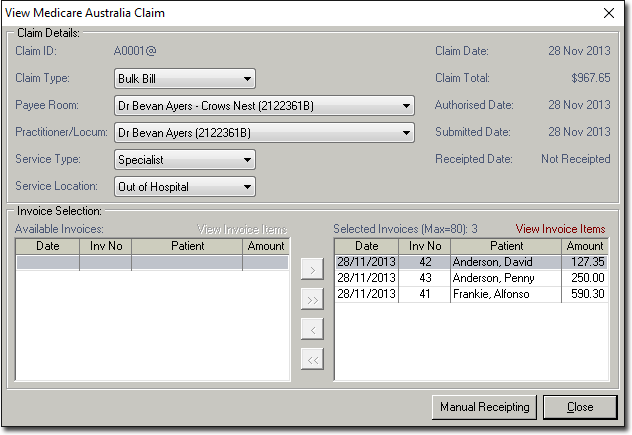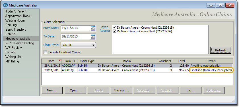 Click OK. to confirm issuing the receipt. Notice that the Medicare Australia - Online Claims window now indicates that the claim was finalised by being manually receipted. You must un-tick the Exclude Finalised Claims check box on this window to view finalised claims.