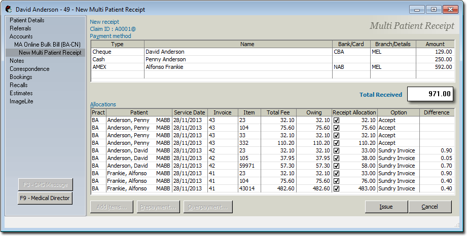 - You can use multiple payment types, indicating which patient has made which payment, as shown in the Payment Method section of the window.
