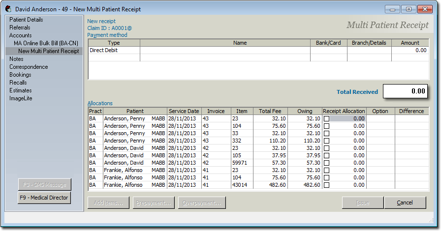 You will be prompted to confirm that you want to manually-receipt the claim, after which the New Multi Patient Receipt window appears.