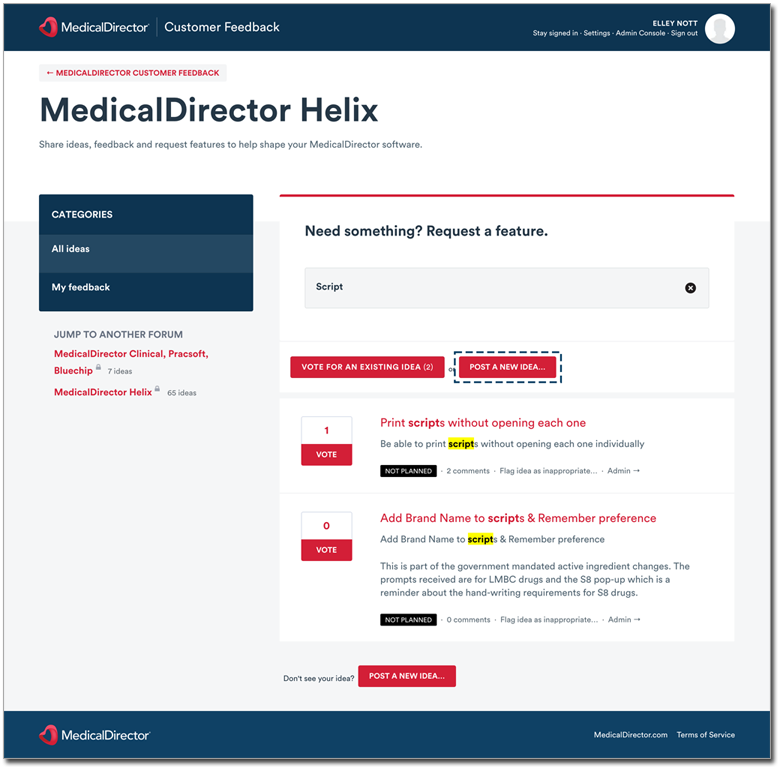 To request a new feature, navigate back to the main MedicalDirector Helix or Clinical, Pracsoft and Bluechip page and first search for the feature using the steps above. If the feature doesn't yet exist, click the red 'Post idea' button.