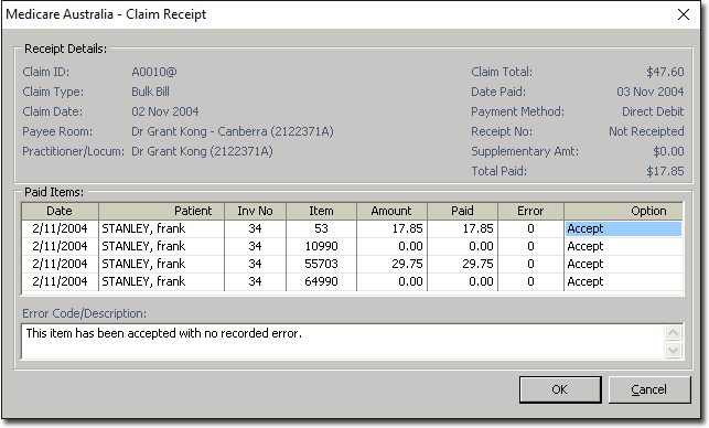 options are: Accept - This option appears when the item is paid in full. Write-Off - A Write-off receipt is created for a difference between the amount of the original invoice and the amount paid for this item. Leave Unpaid - The amount not paid for the invoice item is left outstanding. Sundry Invoice - This option appears when the amount paid is greater than the amount claimed and cannot be changed. Add KM Allowance - This option is applicable to DVA claims where a KM allowance has been paid. As this item is not directly invoiced, the amount has to be accounted for differently and does not appear in the receipts listing or have allocation records. |