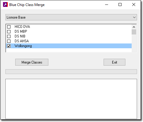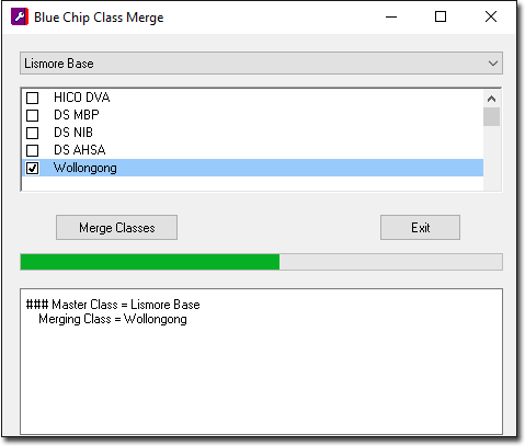 Select BC Tools > Utilities > Merge Classes. Bluechip will need to close, and you will be prompted of such. You will then be prompted to provide the Authorisation Code to access the merge utility. This code must be provided to you by MedicalDirector Customer Service.