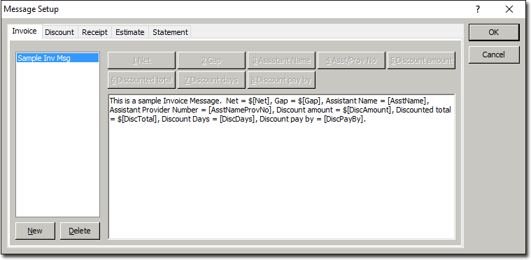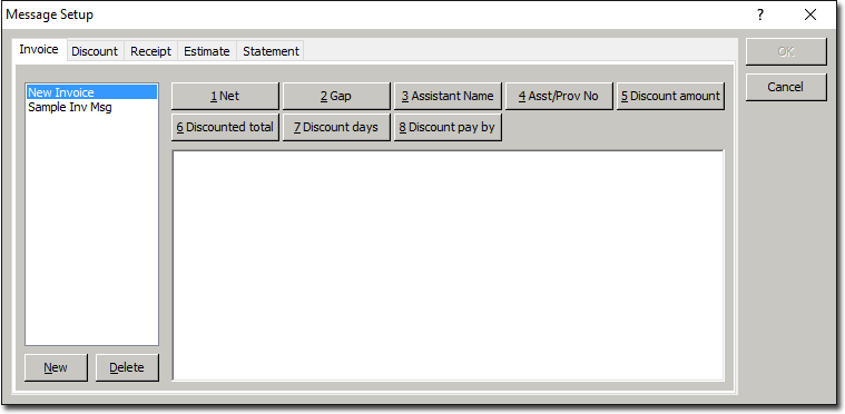 - Field Codes: Field Codes are placeholders for data. These placeholders get replaced for the data they represent at the time the message is used. For example, instead of entering an Assistant's name into the message (in which case you might need to create a new message for each Assistant who works at your practice), you can simply use the Field Code of [AsstName]. When the message is used in a document, the [AsstName] field is automatically replaced by the actual Assistant's name. To add field codes to your message body, click the insert point where you would like the field to appear, and then click the appropriate numbered Field Code button from those provided at the top of the Message Setup window. Note that some of the Message Setup window tabs do not provide Field Code buttons.