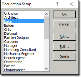- To edit an occupation, select the occupation and then click the Edit button. The New Occupation window appears. Make your modification to the occupation and then click OK. to save the change.