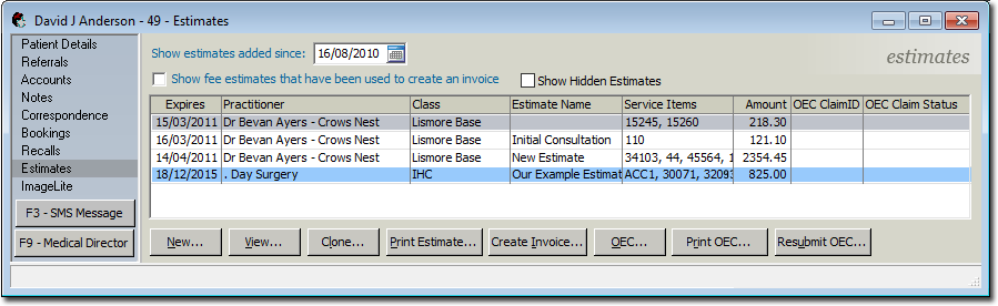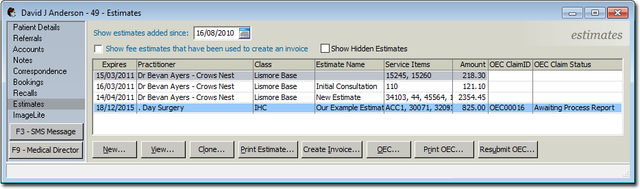 Within the patient's record, select the Estimates menu item. In the example below, we have created an estimate for an In-Hospital Claim, and we will conduct an OEC for this estimate.