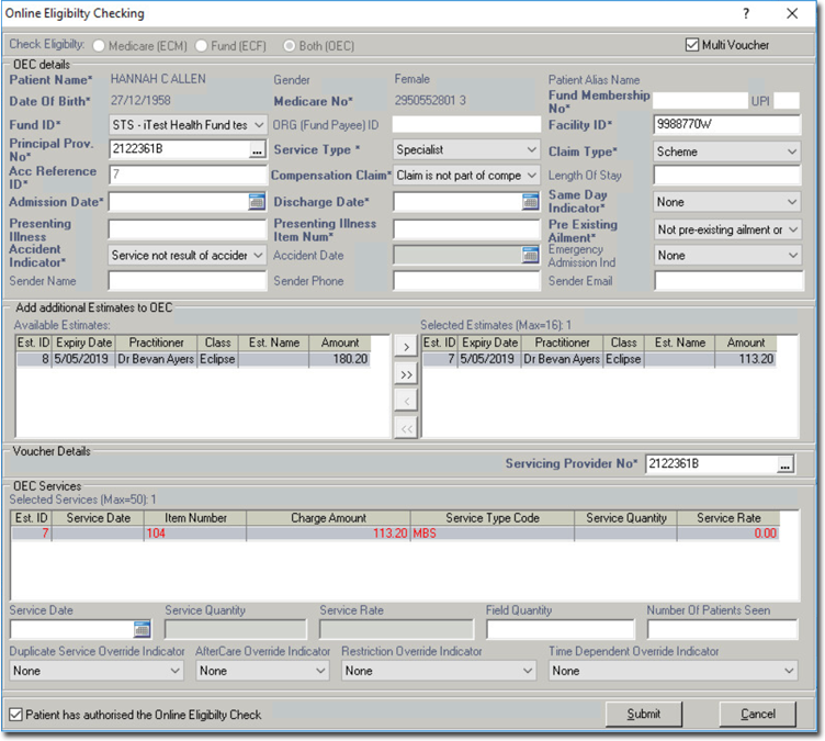 NOTE: If you have multiple estimates for the same hospital, you can submit them together. Tick the Multi Voucher check box, and it will bring all the estimates under the same Hospital. An example is shown below.