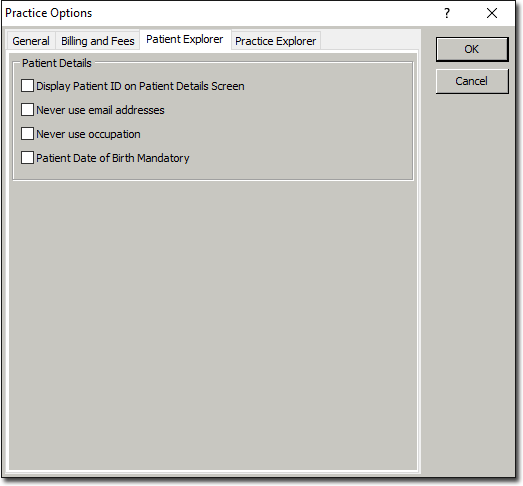 | Never Use Occupation | Hides the occupation field from the Patient Explorer window. |