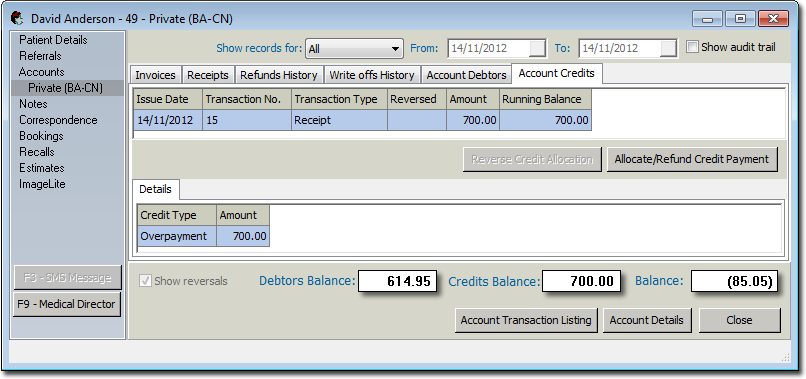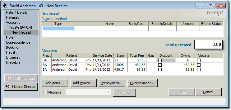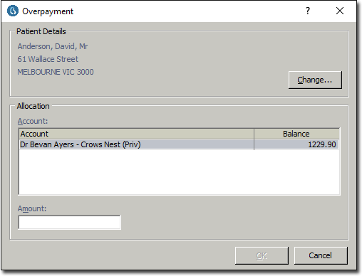 Overpayments are dealt with in a similar manner to prepayments. In the receipt, after you have allocated the receipt items to the appropriate services, you should find that you end up with an amount unallocated.