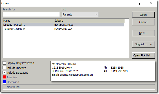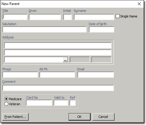 It is important to note that an existing patient record can not be used as the Parent record of another patient record. Rather, you must create a separate Parent record for that person i.e. they will end up with two records in Bluechip - one as Patient, and one as Parent.