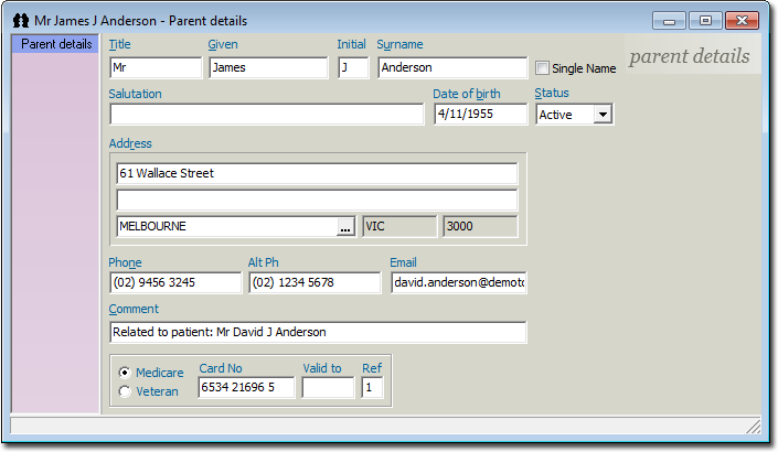 Note also that although you might have a Parent record and a Patient record for the same person, there is no link between the two records. Therefore if you make changes to one record (e.g. demographic changes), you must manually make the same changes to the corresponding record.