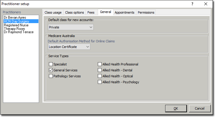 More than one Service Type can be selected. If you do select more than one Service Type, you will be able to indicate which one is to be used for each invoice you create for this practitioner.