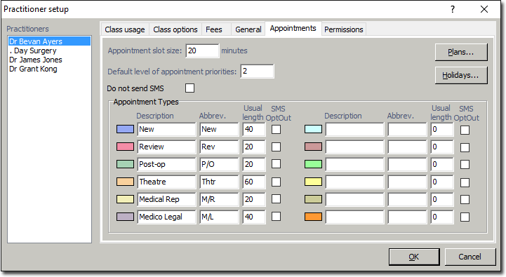 Practitioner SMS Setup Before you begin Procedure Select Setup > Practitioner > Practitioner Details. The Practitioner Setup window appears. Select the Appointments tab. Tick the Do Not Send SMS check box to opt-out altogether, or Opt-out of sending SMS Reminders for certain types of appointments, by ticking the SMS OptOut check box for each Appointment Type. Results