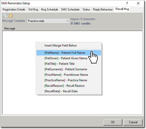 - Create the message. Optionally, right-click in the message body to display a list of merge fields that you can insert into your message. These merge fields are replaced automatically when you send the message. For example, if you enter the merge field [PatName], this will insert the name of the patient for whom you are creating the message. The merge field is inserted at the place where you clicked in the message. The message can have a maximum of 160 alpha-numeric characters, including characters added by merge fields. Bluechip assumes each merge field adds a set number of characters to the message. You can continue typing beyond Bluechip's estimate of the message limit, but the text is displayed in red and struck-through.