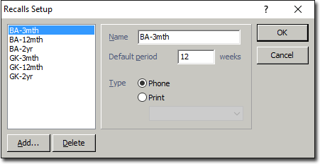 At the time you generate a Recall for a given patient, you must specify the type of recall, for example 'EC 2 Year', or 'WD 12 Month'. Rather than having to type in this information every time, you can record a range of Recall Types that you can select from later. The following information explains how to manage these Recall 'types'.
