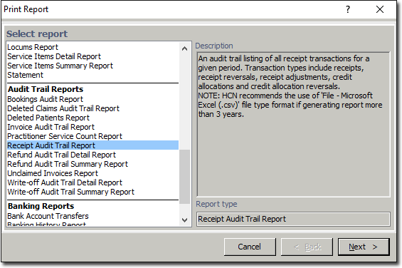 The Receipt Audit Trail report lists all receipt transactions for a specified date range.