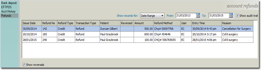 Refunds are performed in a patient's account after banking has been finalised. It does not change an issued invoice or receipt, nor does it change a day's takings. Due to refunds usually being drawn from the practice's account, it records the refund within the Banking module.