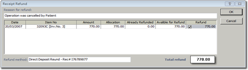 Because the refund is issued after a receipt has been banked, there is no change to the Invoice and Receipt tabs.