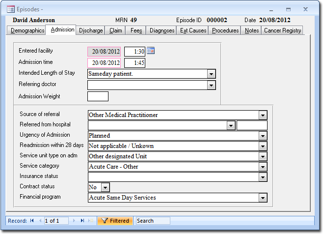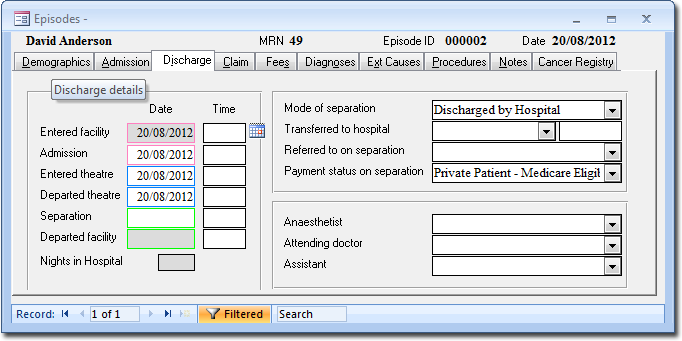 When the patient returns to the Day Surgery to undergo a procedure, the relevant tabs can be completed. These tabs pertain directly to the procedure with data that is known at the time. The following outlines MedicalDirector's preferred methodology for completing these tabs.
