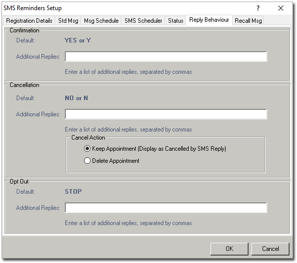 Configure how Bluechip interprets SMS replies from your patients with the Reply Behaviour tab.