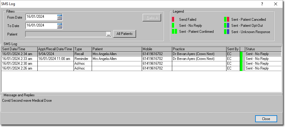 SMS Audit Log A log file of your SMS messages is recorded daily and stored by Bluechip. To view the log for a specific appointment, right-click the appointment and select SMS Audit Log. To view the log for all appointments/patients, select SMS > SMS Audit Log.