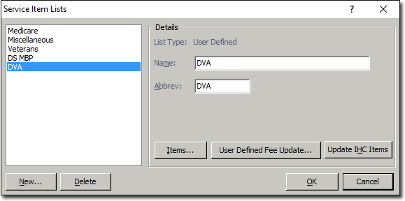 to add items specifically for DVA claiming. The DVA list is for items specific to the DVA, for example CN01 (Clinical Notes), CC01 (Consultation), CP20 (Medication Review) and so forth. This should not include any MBS items. - Click OK to save these details.
