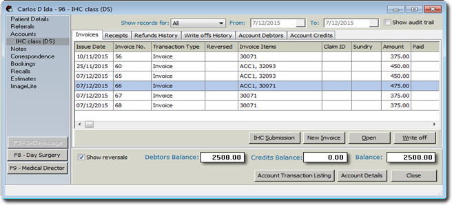 The New In Hospital Claiming (IHC) form appears. All relevant data from the Day