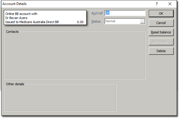 Click OK. The Account > Details window appears. Ensure the correct Practitioner and Class (Bulk Bill) has been selected.