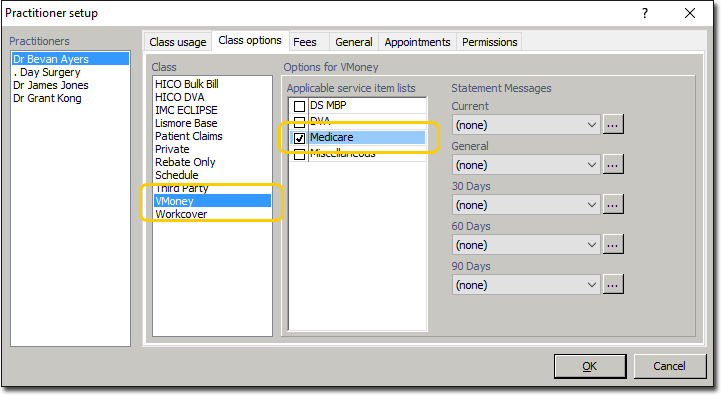 Step 3: Configuration - Associate the VMoney Class with a Practitioner Before you begin Procedure Select Setup > Practitioner > Practitioner Details. The Practitioner Setup window appears. Select the practitioner who will bill with the VMoney account. Select the Class Usage tab. Select the VMoney class you created earlier. Select the Class Options tab. Within the Class section, select the VMoney class you created earlier. Within the Applicable service item lists section, select one or more Service Item Lists to use when billing for the VMoney account. Click OK to save. This practitioner record is now configured to use the VMoney class. Results