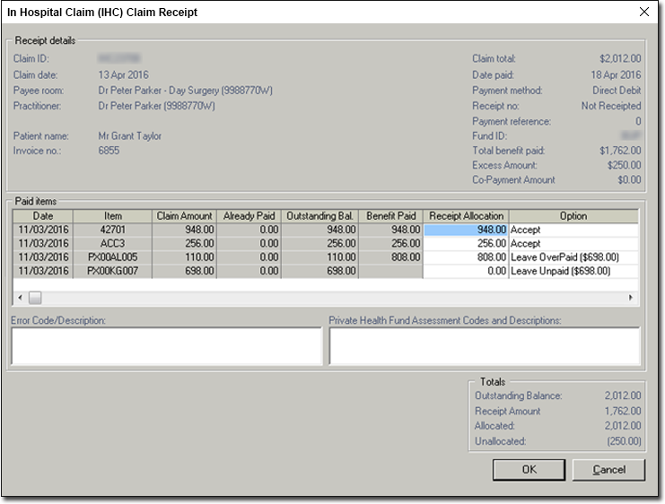 - Take note of the Claim Amounts and Receipt Allocation values for the service items being claimed.