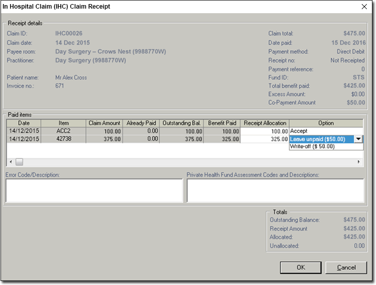 - $100 is automatically allocated to item ACC2, to cover its claim amount of $100. Notice that the Option column reads 'Accept', to indicate that we will accept this allocation.