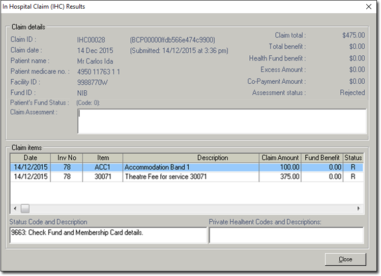 The rejected claim can be viewed by double-clicking the claim. The In Hospital Claim (IHC) Results window appears. The results of processing such as rejection code and description can be viewed. Click