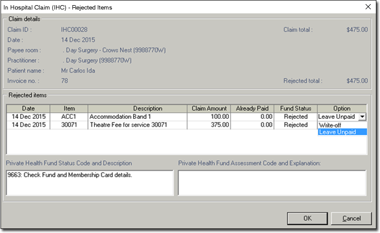 window appears. Rejected Items can be left unpaid or written-off.