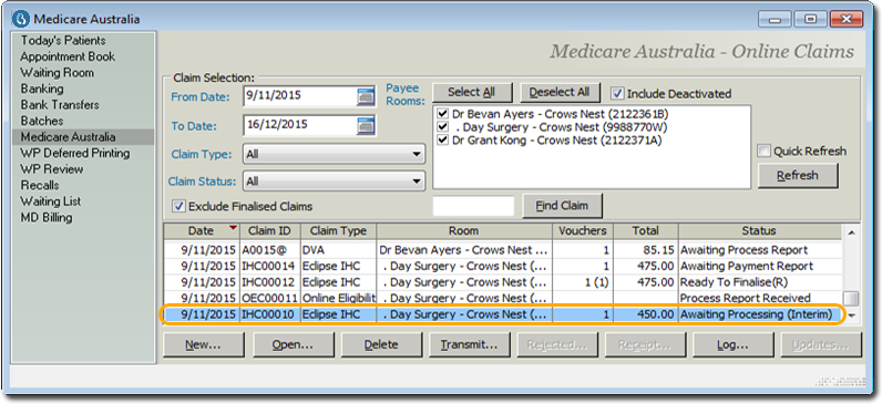 Some claims can be in the 'Awaiting Submission' status in the Medicare Australia window. Claims with this status would have failed the Client Adaptor validation and the claims will have to be edited to ensure successful submission.