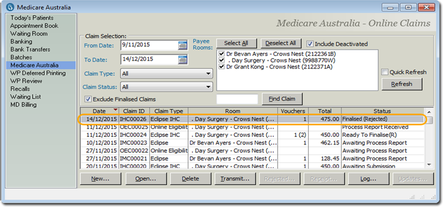 the rejected claim. The rejected claim is now Finalised and status is