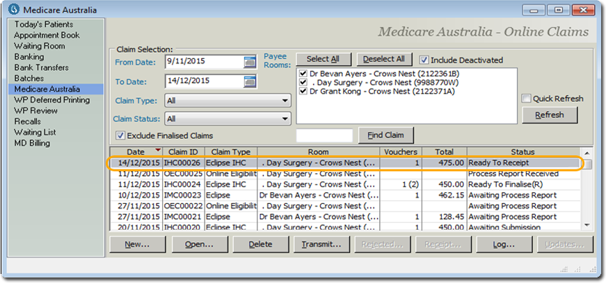 In the Medicare Australia window, the claim's status changes to 'Ready to Receipt'.