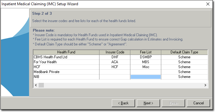 In this step, select an Insurer Code, Fee List and Default Claim Type for each Health Fund. To do this, double-click the appropriate field to reveal a drop-down list from which you can make a selection.