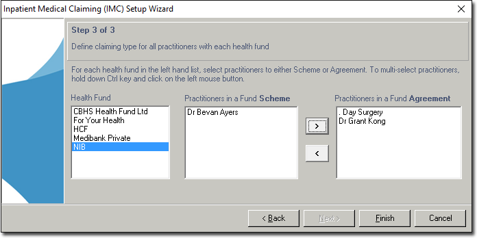 - For each practitioner associated with a Fund Agreement instead, you must move them to the Fund Agreement column. To do this select a practitioner from the Fund Scheme list and then click the > button to transfer them to the Fund Agreement list, or simply double-click them.