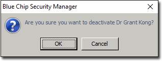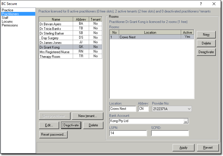 button, to indicate that the selected practitioner record can be reactivated if you desire. - You cannot add or reactivate rooms associated with the deactivated practitioner. You can however delete a room associated with him.