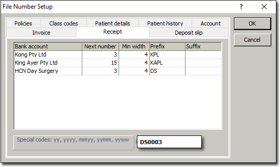 The example selected in the image above indicates the File Number format for receipts generated on behalf of MedicalDirector Day Surgery. Note the preview window at the bottom-right of the window, which indicates that:- All receipts for MedicalDirector Day Surgery have a prefix of DS.