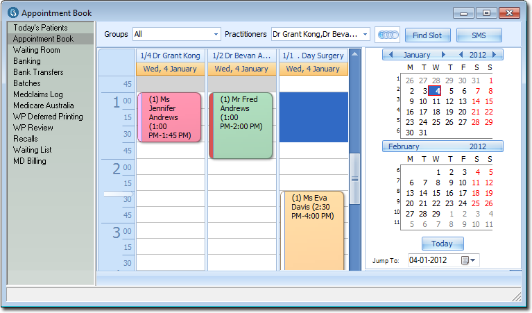 - Each appointment type is signified by a different colour. By using different colours, it is easy to see which types of appointments have been scheduled for each practitioner. For example, the following image indicates that Dr Kong has a Review at 1:00 pm, because for Dr Kong, appointments of type 'review' are displayed in pink. Similarly, Dr Ayers' appointment at 1:00 is a Procedure, because for Dr Ayers, 'procedure' appointments are displayed in green.