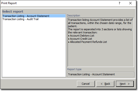 5. In the Print Report window, select either the Transaction Listing - Account Statement report or Transaction Listing - Audit Trail report, and click Next.