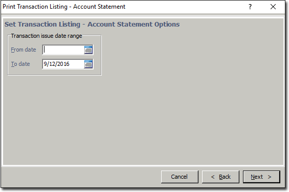 6. In the Print Transaction Listing window, set the date range for the report and click Next. Today's date is displayed in the To date field by default.