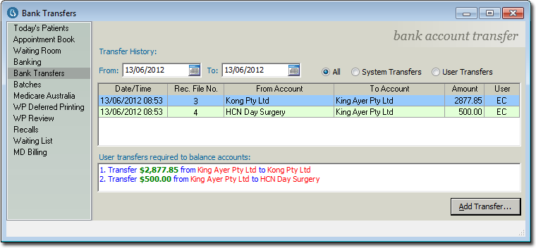 Within the Practice Explorer, select the Bank Transfer menu item. The Bank Transfer window appears.