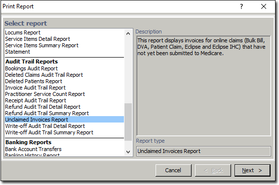 Unclaimed Invoices Report Before you begin Procedure Either: Click Press Ctrl + P Select Reports > PrintThe Print Report window appears. Select the Unclaimed Invoices Report from the list provided, and click Next The criteria window for the selected report will appear. Select your desired criteria as necessary. Click Next when you are ready to proceed. Results
