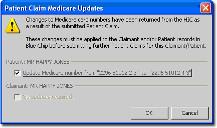 If the patient details (patient given name, medicare card number, and patient reference number) held by Bluechip are different to those held by Medicare, you are prompted to automatically update the patient record.